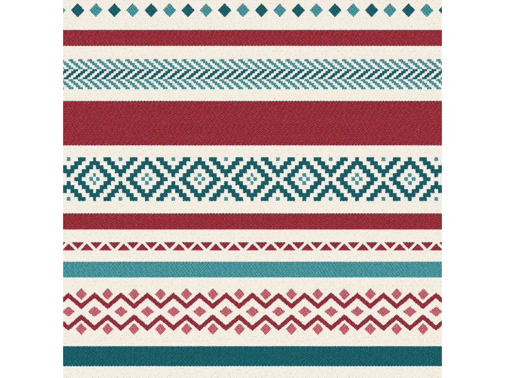 Látka s mírným leskem v barvě: tmavě červené pruhy a zelená s tyrkysovou září a světle béžová |