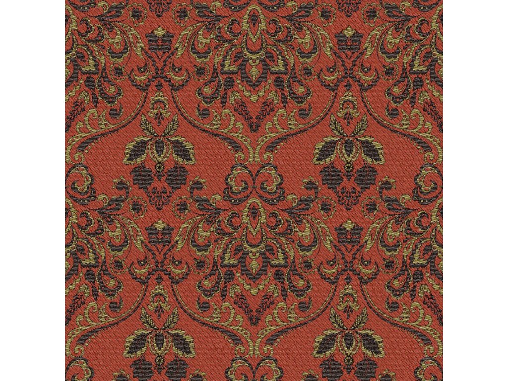 pozadí pruhované žinylky v saténově matném provedení ve stinné terakotové barvě , lesklý vzor látky - tmavě zlatá a velmi tmavě šedá/černá |